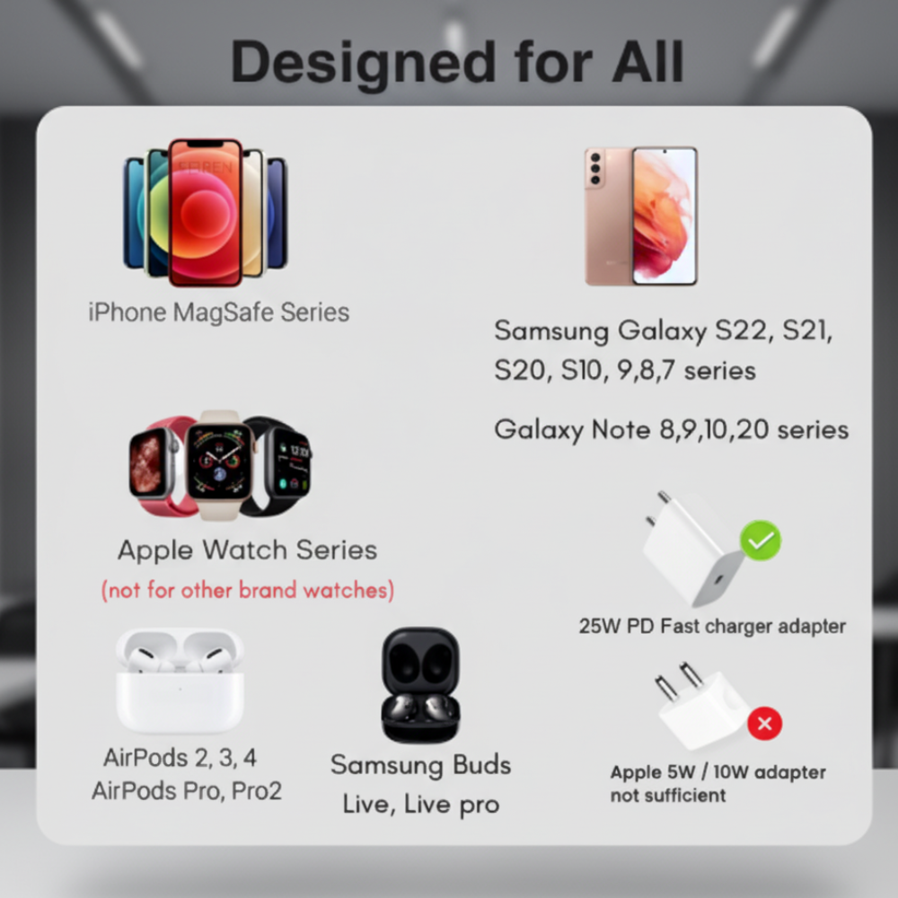 Stay powered up effortlessly with this 3-in-1 MagSafe Magnetic Foldable Wireless Charger. Designed to charge your iPhone, Apple Watch, and AirPods simultaneously, it’s the ultimate space-saving solution for home, office, or travel. Its foldable design ensures portability while the strong magnetic alignment guarantees a secure and efficient charge every time.